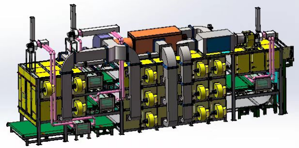 烘干設(shè)備有四個(gè)噴嘴機(jī)構(gòu),對(duì)材料進(jìn)行噴涂,噴涂后進(jìn)入烘干室。烘干室采用天然氣燃燒機(jī)加熱。風(fēng)場穩(wěn)定、熱均勻性良好。